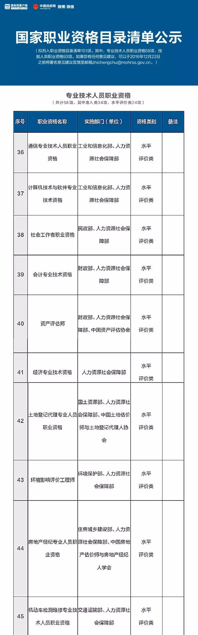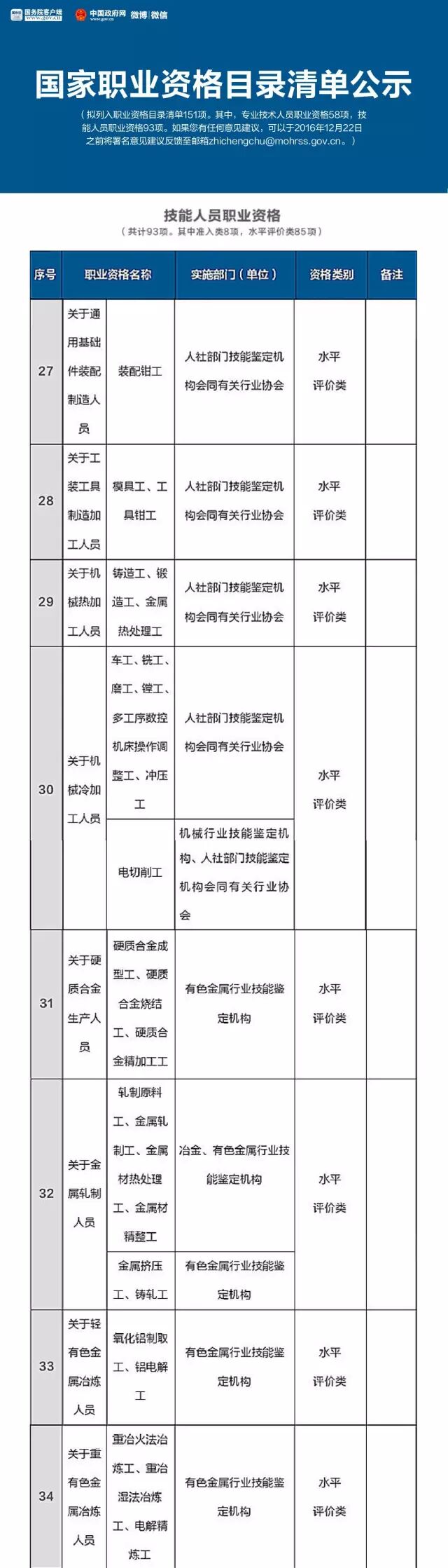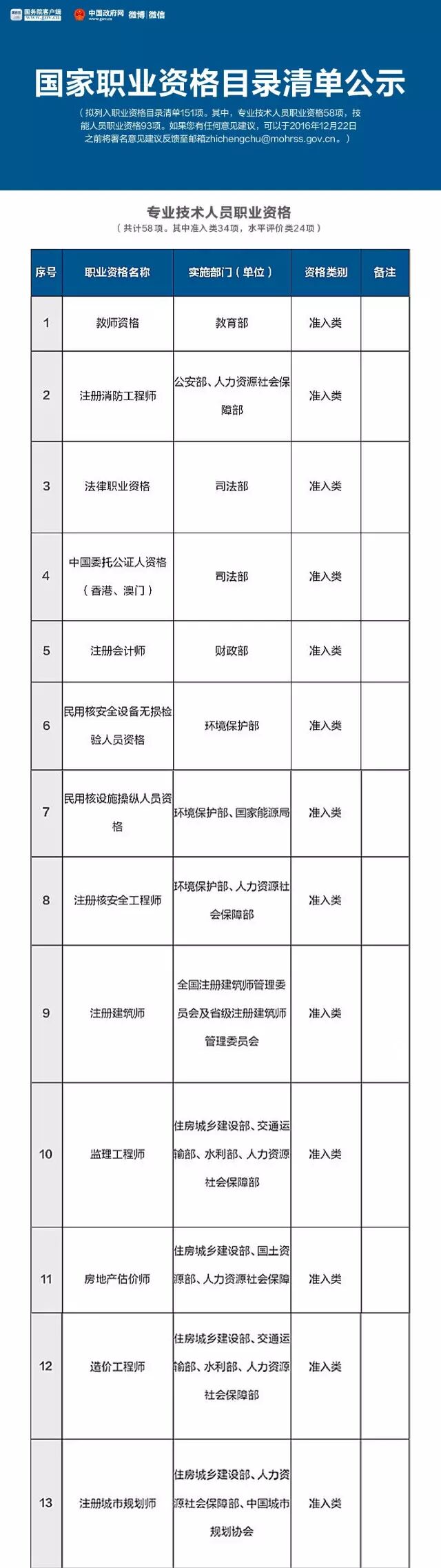 就在这个月的16号,人力资源和社会保障部公示了国家职业资格目录清单,拟列入职业资格目录清单151项。其中,专业技术人员职业资格58项,技能人员职业资格93项。