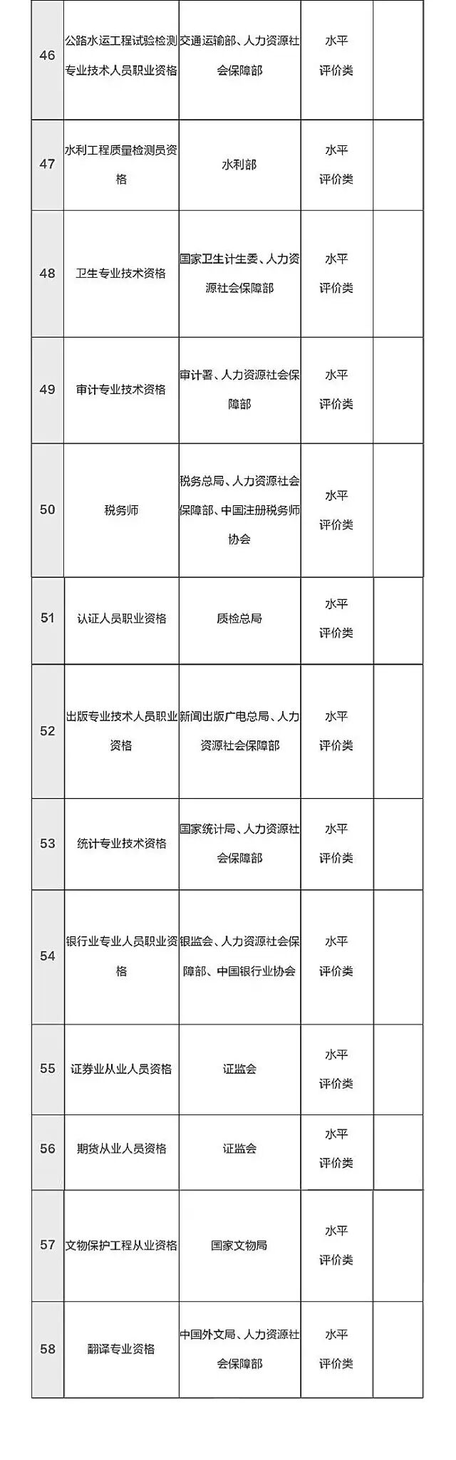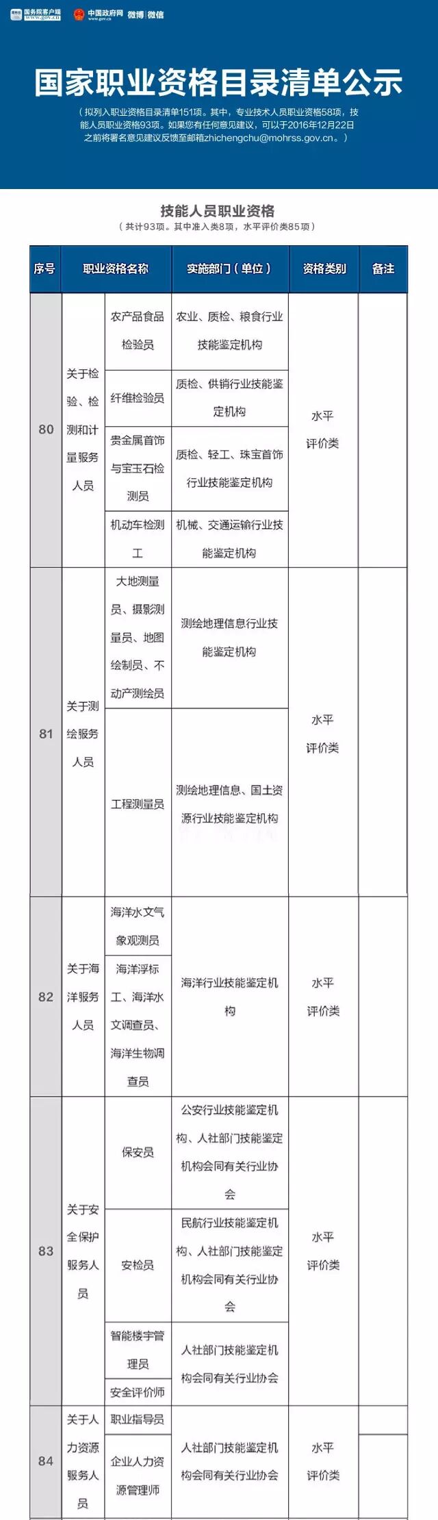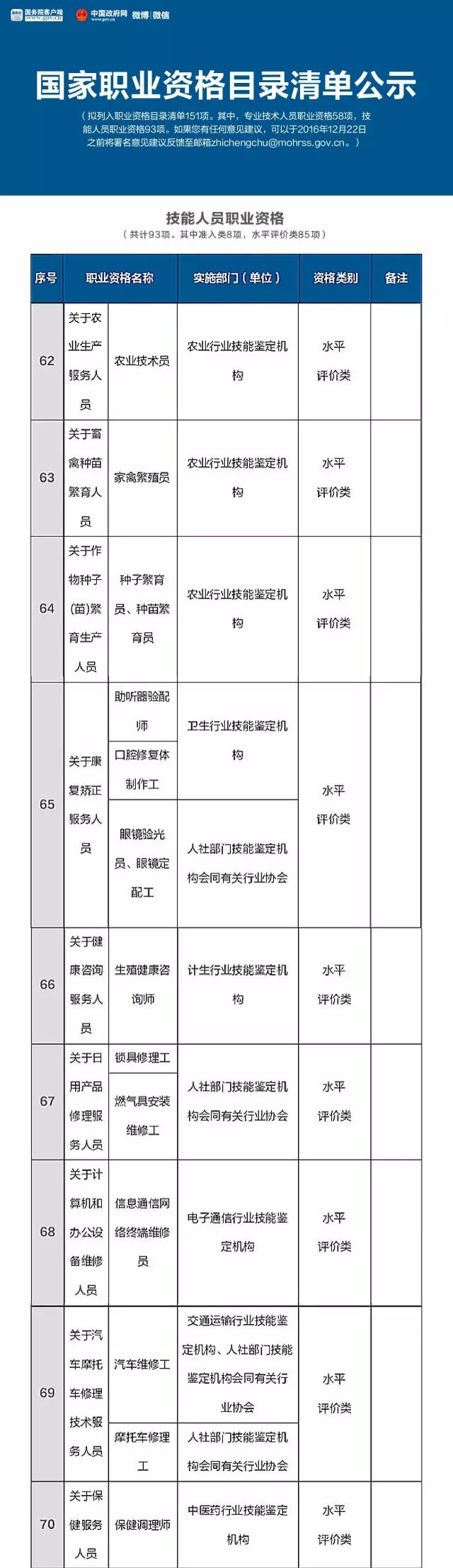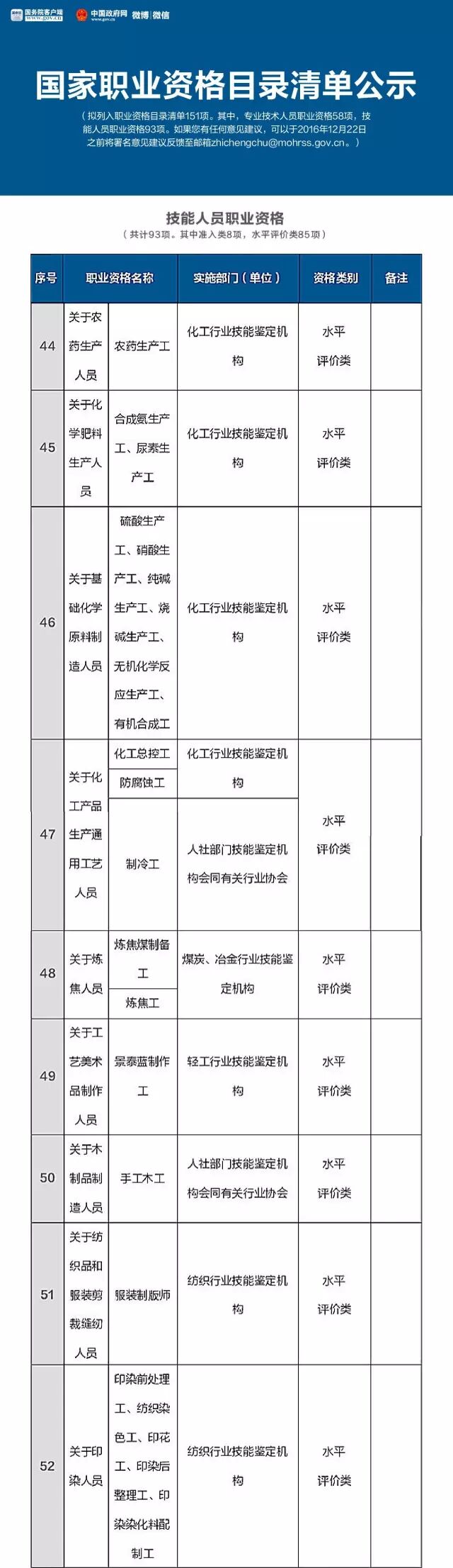 就在这个月的16号,人力资源和社会保障部公示了国家职业资格目录清单,拟列入职业资格目录清单151项。其中,专业技术人员职业资格58项,技能人员职业资格93项。