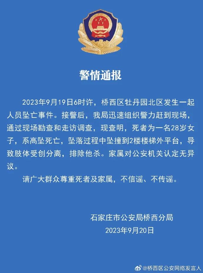 2023年9月19日6时许,桥西区牡丹园北区发生一起人员坠亡事件。接警后,我局迅速组织警力赶到现场,通过现场勘查和走访调查,现查明,死者为一名28岁女子,系高坠死亡,坠落过程中坠撞到2楼楼梯外平台,导致肢体受创分离,排除他杀。家属对公安机关认定无异议。请广大群众尊重死者及家属,不信谣、不传谣。