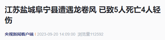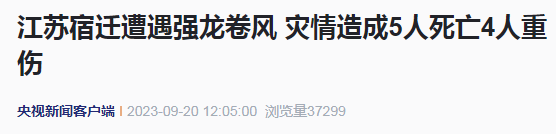 据央视新闻客户端20日消息,9月19日17时20分许,江苏省宿迁市宿豫区大兴镇、市经开区南蔡乡局地陆续发生强龙卷风,等级判定为EF2级,造成部分地区人员伤亡和财产损失。