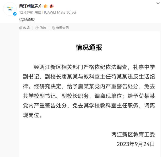 9月22日,重庆两江新区教育局发布通告称,对于近日网上出现的礼嘉中学负责人不当行为的帖文,相关部门已正式立案调查,将依法依规严肃处理。