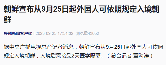 据中央广播电视总台记者消息,朝鲜宣布从9月25日起外国人可依照规定入境朝鲜,入境后需接受2天医学隔离。