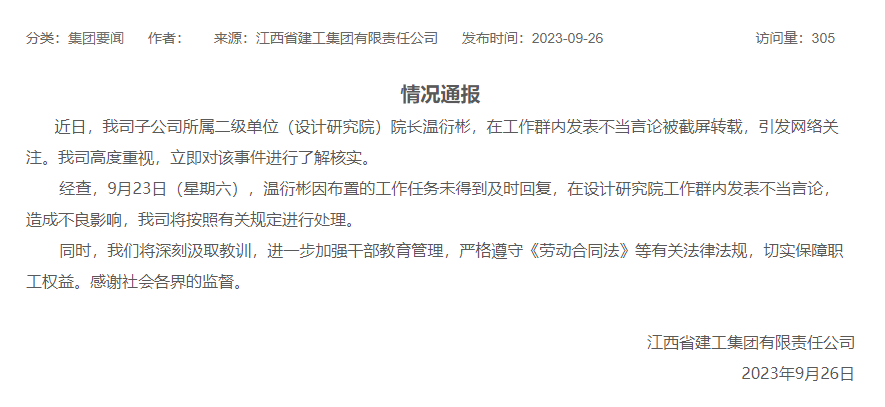 近日,“国企设计院院长称取消周末”引发关注,9月26日,江西省建工集团有限责任公司发布情况通报:近日,我司子公司所属二级单位(设计研究院)院长温衍彬,在工作群内发表不当言论被截屏转载,引发网络关注。我司高度重视,立即对该事件进行了解核实。