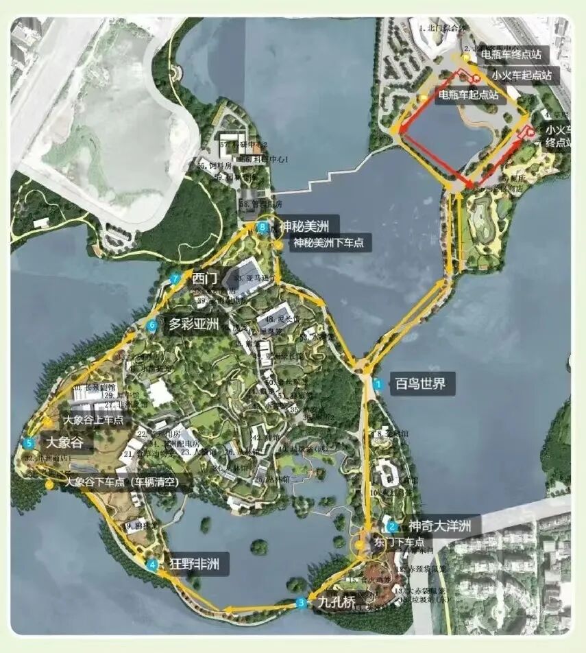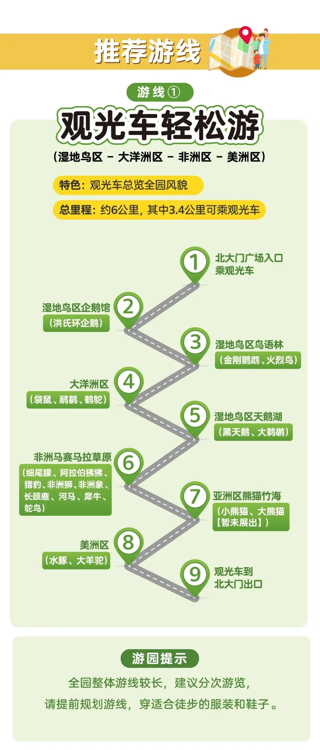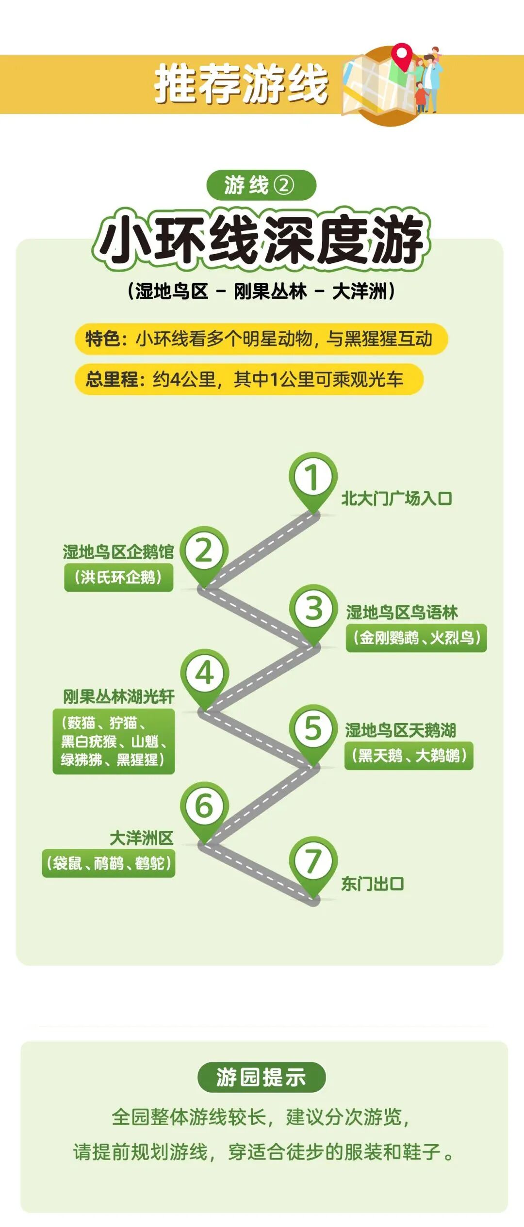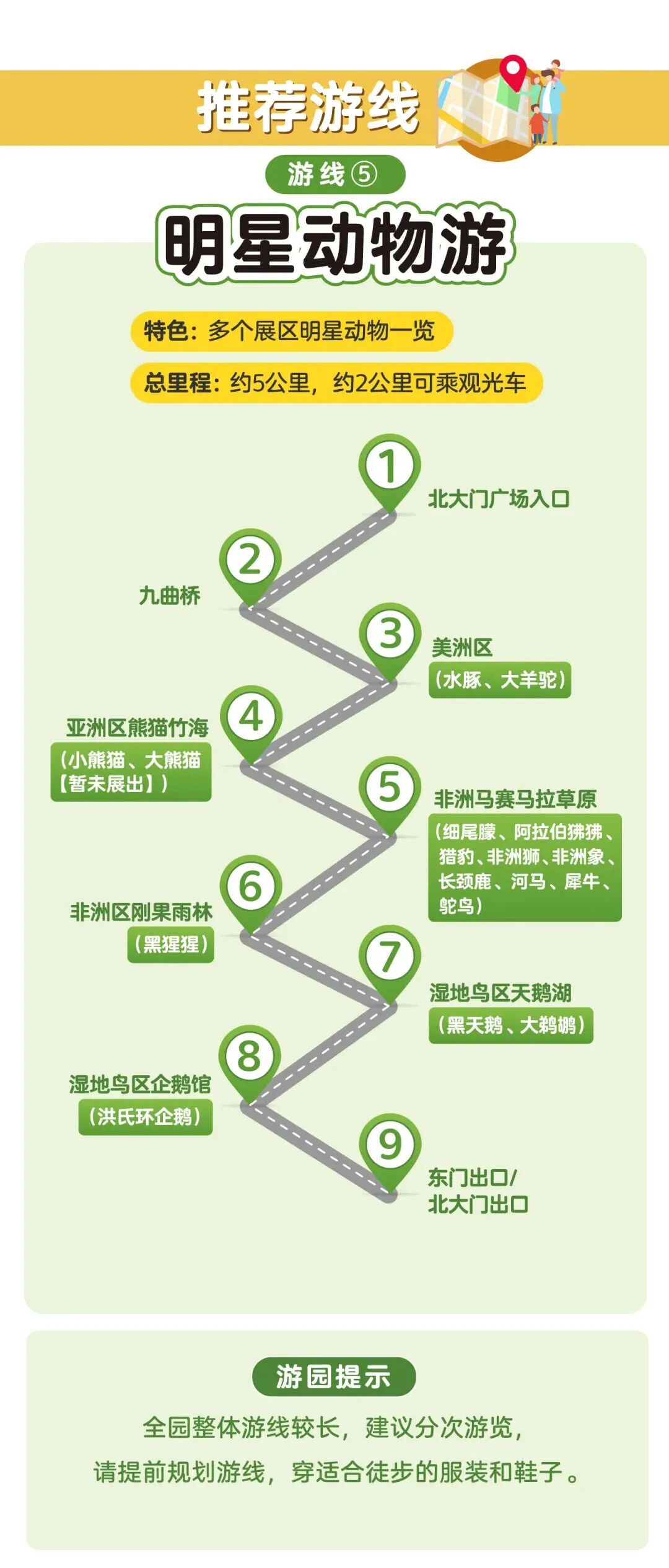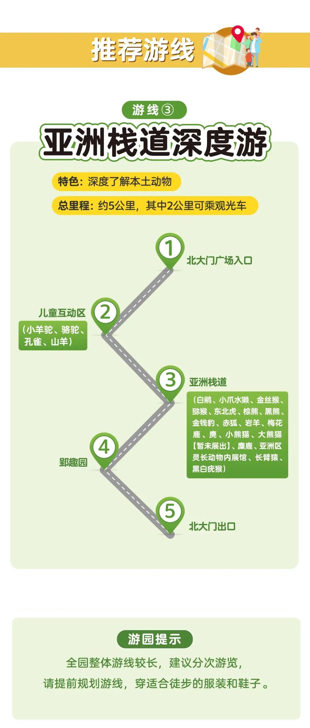 游玩路线沿途共有「5个临时售卖点」。可自带食物、饮水进园。
