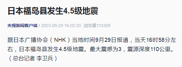 日本福岛突发! 2023-09-30 08:40 央视新闻客户端 0 据日本广播协会(NHK)当地时间9月29日报道,当天16时58分左右,日本福岛县发生4.5级地震。最大震感为3,震源深度110公里。