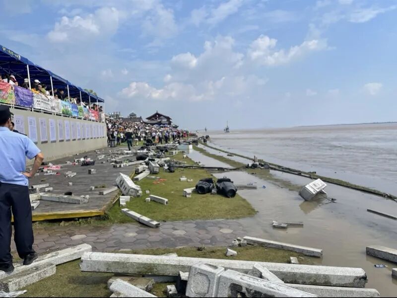 10月1日,有网友发布视频称,浙江嘉兴海宁盐官观潮景区因钱塘江浪潮太大,护栏被冲塌,多名游客被冲倒。一名在现场的游客告诉记者,他家人受了些皮外伤,景区工作人员进行了简单处理并为其退票。海宁市公安局观潮派出所一名工作人员表示,目前人员伤亡情况不便透露,景区开放情况会另行通知。