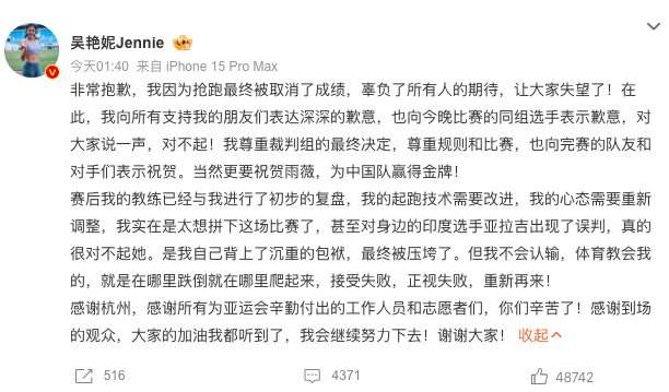 吴艳妮深夜发文道歉:“非常抱歉,我因为抢跑最终被取消了成绩,辜负了所有人的期待,让大家失望了!在此,我向所有支持我的朋友们表达深深的歉意,也向今晚比赛的同组选手表示歉意,对大家说一声,对不起!我尊重裁判组的最终决定,尊重规则和比赛,也向完赛的队友和对手们表示祝贺。当然更要祝贺雨薇,为中国队赢得金牌!”