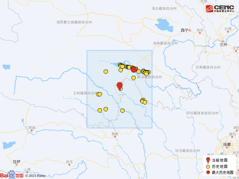 根据中国地震台网速报目录,震中周边200公里内近5年来发生3级以上地震共111次,最大地震是2021年5月22日在青海果洛州玛多县发生的7.4级地震(距离本次震中131公里),按震级大小前50次历史地震分布如图。