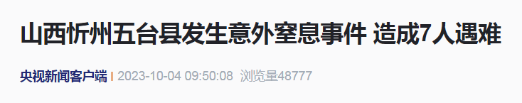 痛心!山西发生意外窒息事件,7人遇难 2023-10-04 10:18 央视新闻客户端 0 据央视新闻客户端4日消息,记者从山西省忻州市委宣传部获悉,2023年10月3日,山西省忻州市五台县豆村镇兴坪村发生一起意外窒息事件,造成7人遇难。目前,救援已经结束,原因正在调查中。