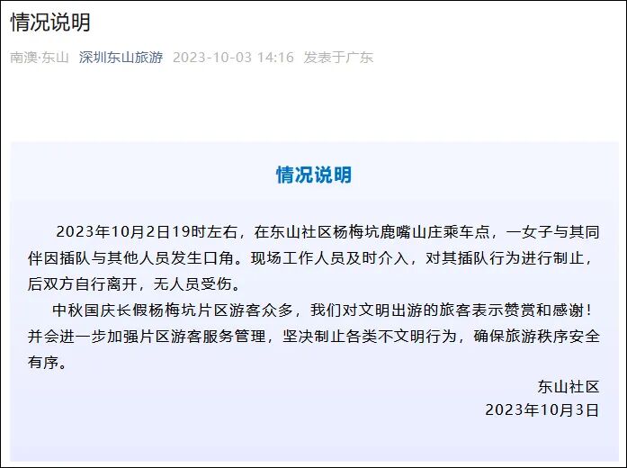 据微信公众号“深圳东山旅游”消息,深圳东山社区10月3日发布情况说明称,2日19时左右,在东山社区杨梅坑鹿嘴山庄乘车点,一女子与其同伴因插队与其他人员发生口角。现场工作人员及时介入,对其插队行为进行制止,后双方自行离开,无人员受伤。