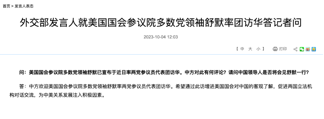 答:中方欢迎美国国会参议院多数党领袖舒默率两党参议员代表团访华。希望通过此访增进美国国会对中国的客观了解,促进两国立法机构对话交流,为中美关系发展注入积极因素。