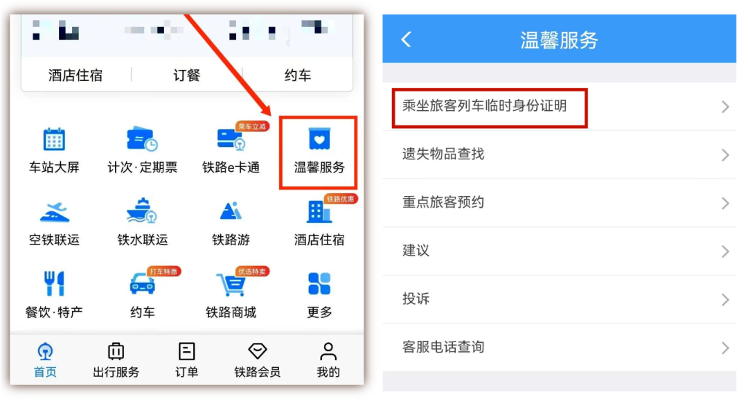 打开“铁路12306”APP首页,点击“温馨服务”,选择“临时身份证明”,按提示填写个人真实信息,进行人脸识别。审核通过后,即可凭相关票证顺利进站。