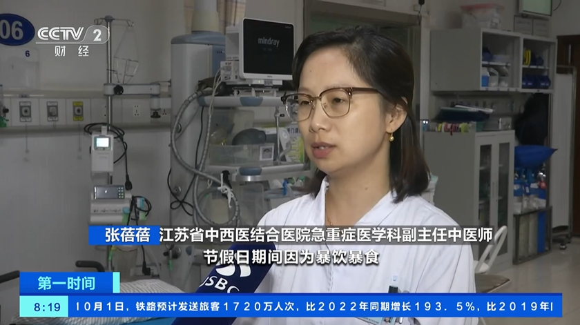 江苏省中西医结合医院急重症医学科副主任中医师 张蓓蓓:节假日期间因为暴饮暴食,急性胰腺炎的发病率比较高,特别是重度胰腺炎,属于高风险的疾病,很容易引起多脏器功能衰竭。