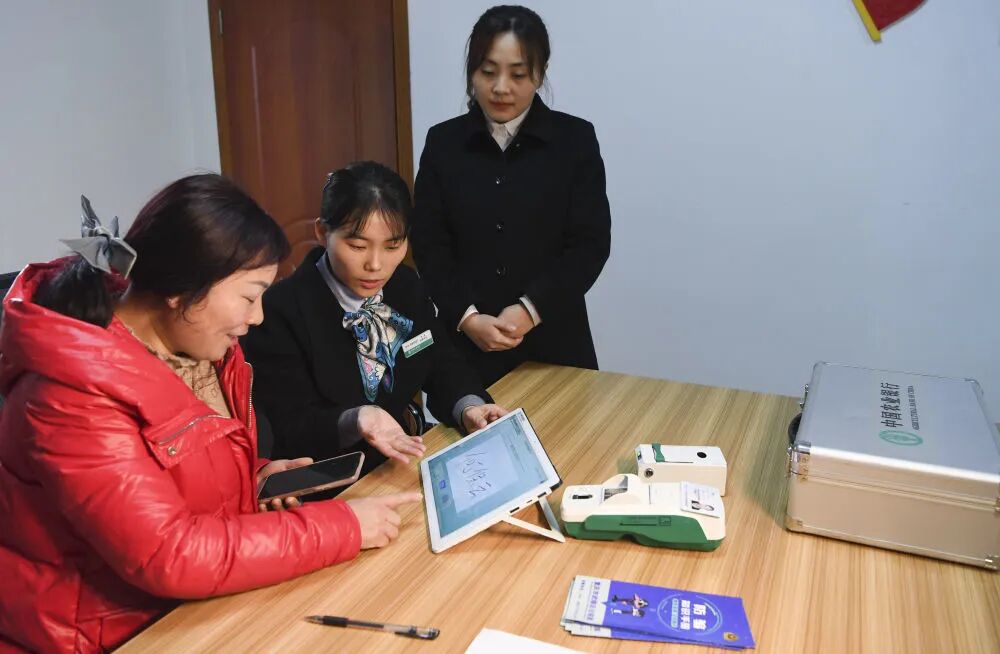 2022年1月20日,重庆市武隆区双河镇团兴村村民何保云(左一)在中国农业银行重庆武隆支行工作人员指导下办理“乡村振兴”主题银行卡。新华社记者 王全超 摄