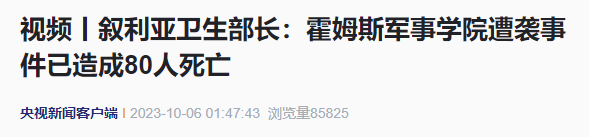 另据叙利亚国家通讯社最新消息,10月5日发生在叙利亚霍姆斯军事学院的恐怖袭击事件已导致80人死亡,近240人受伤,其中包含平民和军人。