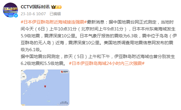 最新消息:据中国地震台网正式测定,当地时间今天(6日)上午10点31分(北京时间上午9点31分),日本本州东南海域发生5.9级地震,震源深度10公里。日本气象厅报告的震级为6.3级,震中位于鸟岛(伊豆群岛的无人岛)近海,震源深度10公里。美国地质调查局地震信息网发布的震级为6.1级。