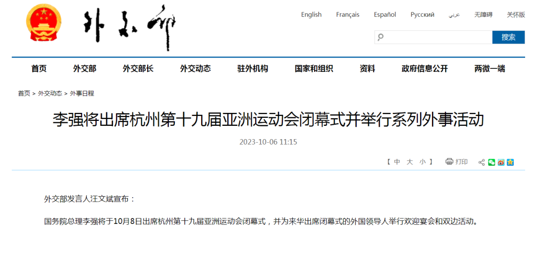 外交部刚刚宣布! 2023-10-06 11:59 环球时报 0 外交部发言人汪文斌宣布: 国务院总理李强将于10月8日出席杭州第十九届亚洲运动会闭幕式,并为来华出席闭幕式的外国领导人举行欢迎宴会和双边活动。