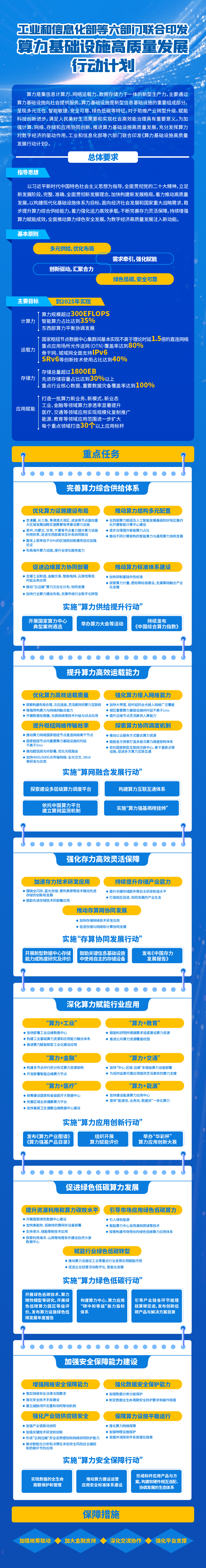 工业和信息化部、中央网信办、教育部、国家卫生健康委、中国人民银行、国务院国资委等六部门近日联合印发《算力基础设施高质量发展行动计划》。