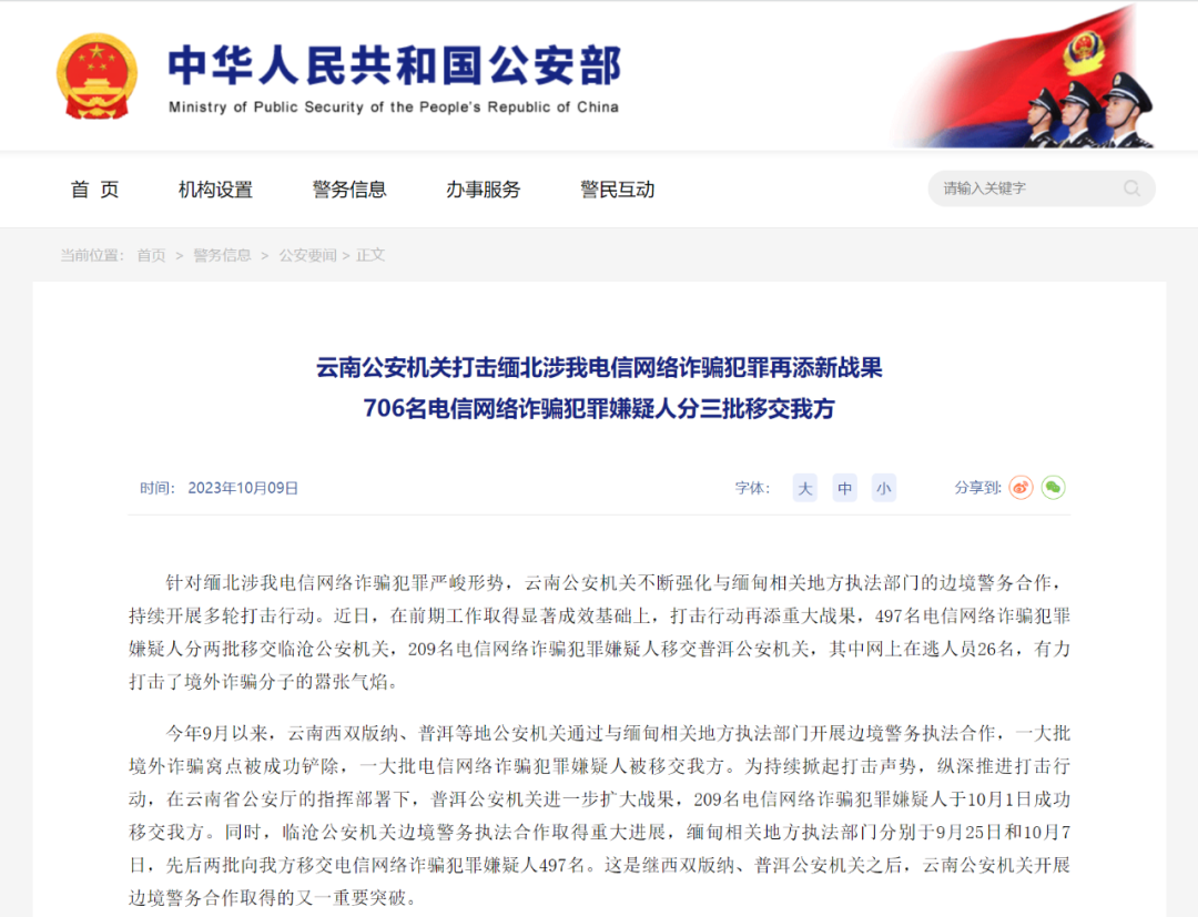 云南公安机关打击缅北涉我电信网络诈骗犯罪再添新战果706名电信网络诈骗犯罪嫌疑人分三批移交我方