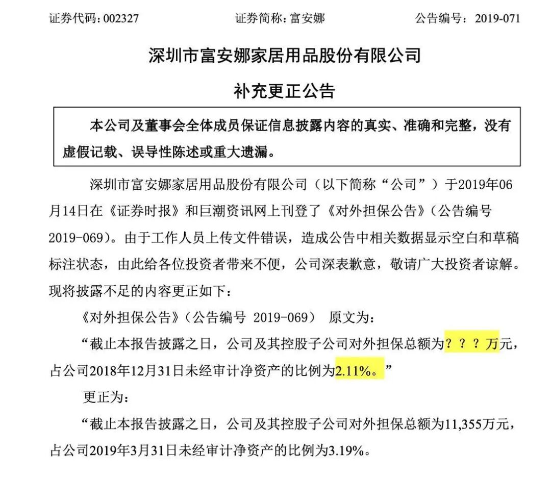 2019年6月,富安娜还因工作人员上传文件错误,发布过一版“草稿版公告”,造成公告中相关数据显示空白和草稿标注状态。