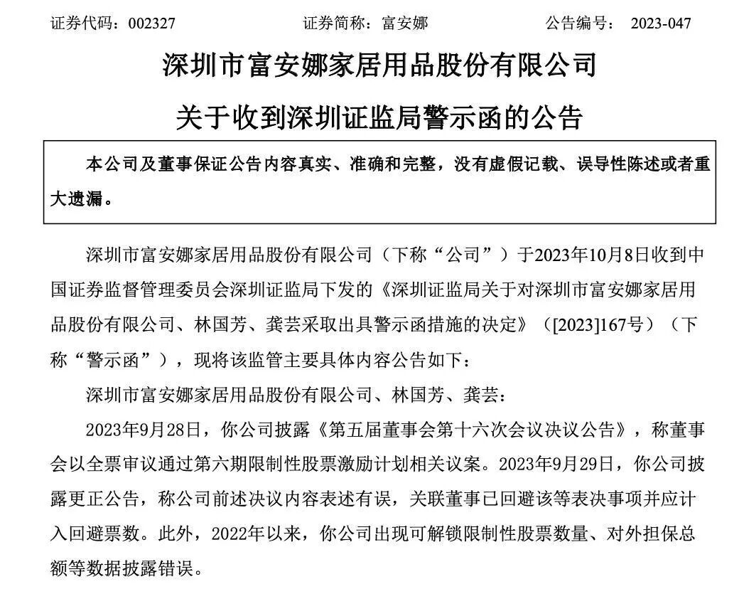 10月9日,富安娜(002327.SZ)公告称,因数据披露等事项,公司于8日收到《深圳证监局关于对深圳市富安娜家居用品股份有限公司、林国芳、龚芸采取出具警示函措施的决定》(下称《警示函》)。