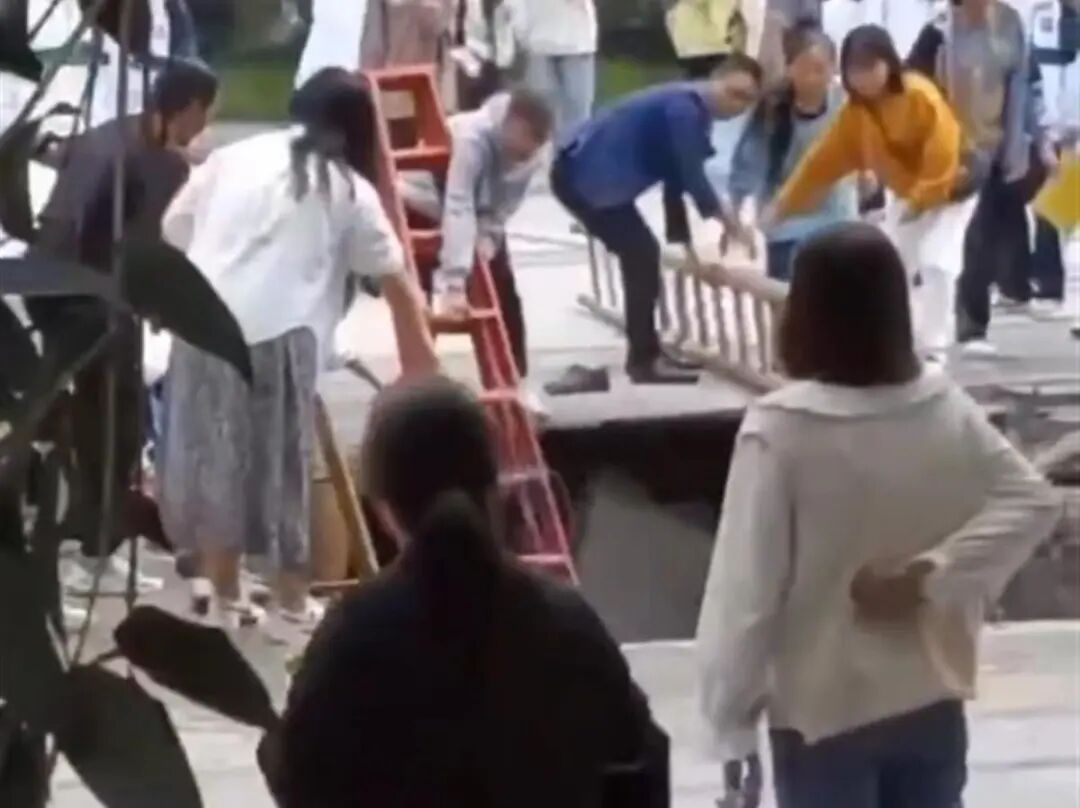 网传视频显示,学校操场地面出现塌陷,出现深坑。现场人员正用长梯等工具,在坍塌处开展救援,多名身着校服的学生在事发现场围观,并用手捂住口鼻。