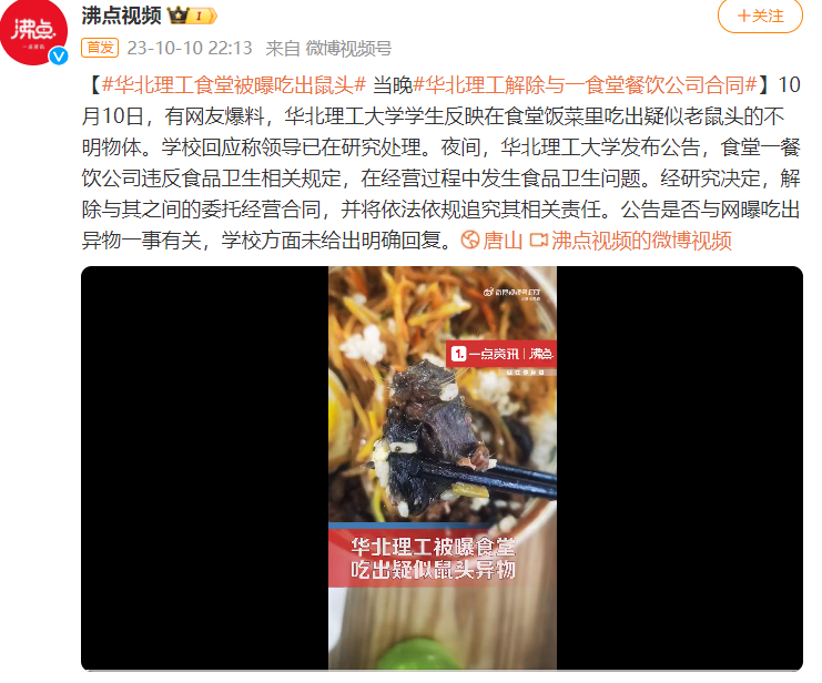 10月10日,有网友爆料,华北理工大学学生反映在食堂饭菜里吃出疑似老鼠头的不明物体。学校回应称领导已在研究处理。夜间,华北理工大学发布公告,食堂一餐饮公司违反食品卫生相关规定,在经营过程中发生食品卫生问题。经研究决定,解除与其之间的委托经营合同,并将依法依规追究其相关责任。公告是否与网曝吃出异物一事有关,学校方面未给出明确回复。