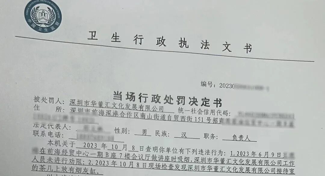 执法人员依据《深圳经济特区控制吸烟条例》第三十八条,对深圳市华董汇文化发展有限公司作出警告,责令其立即改正违法行为。