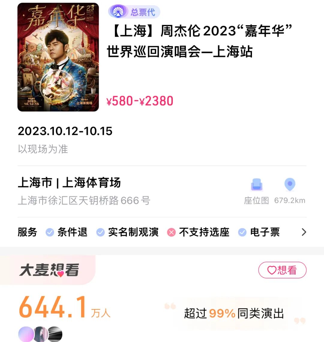 其中大麦网约放出7万张,猫眼放出约4.1万张,而票星球只放出2400张票。然而单单大麦平台上就有644.1万人标记了“想看”。