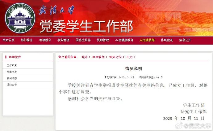 10月13日,武汉大学发布处理通报: