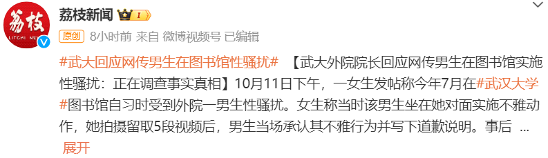 据媒体报道,10月11日下午,一女生发帖称今年7月在武汉大学图书馆自习时受到外院一男生性骚扰。