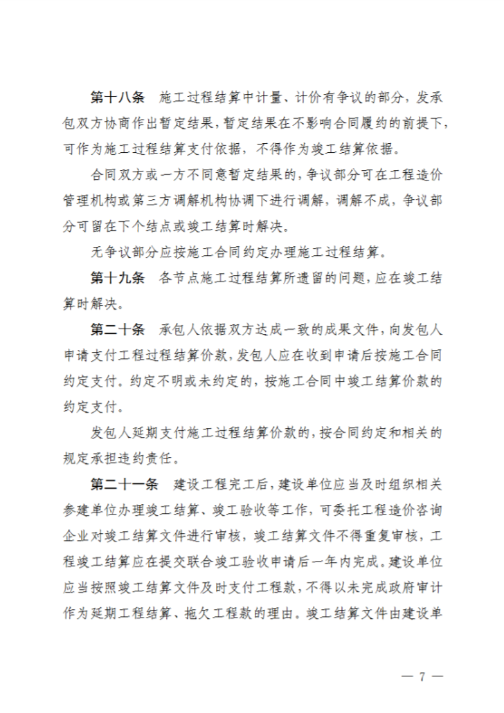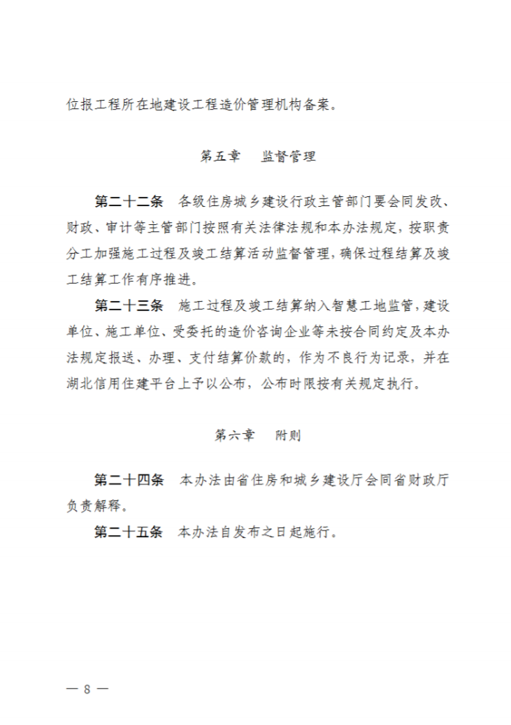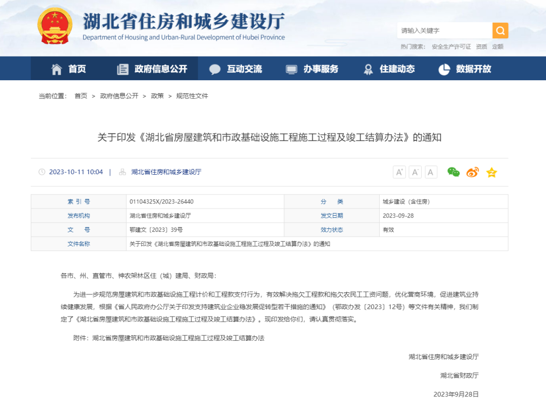 为进一步规范房屋建筑和市政基础设施工程计价和工程款支付行为,有效解决拖欠工程款和拖欠农民工工资问题,优化营商环境,促进建筑业持续健康发展,根据《省人民政府办公厅关于印发支持建筑业企业稳发展促转型若干措施的通知》(鄂政办发〔2023〕12号)等文件有关精神,近日,湖北省住房和城乡建设厅制定并印发《湖北省房屋建筑和市政基础设施工程施工过程及竣工结算办法》。