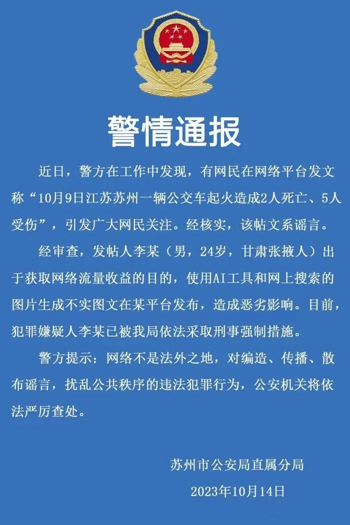 苏州公安微警务微信公众号14日晚间发布警情通报:“苏州公交车起火造成2死5伤”系谣言,发帖人用AI工具生成不实图文。