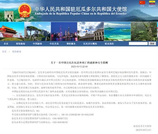10月13日晚,中国驻厄瓜多尔大使馆发布通报称,当地时间10月2日晚19时,厄瓜多尔政府向中国驻厄瓜多尔使馆通报一名中国公民在钦博拉索省里奥班巴地区旅游期间发生意外。