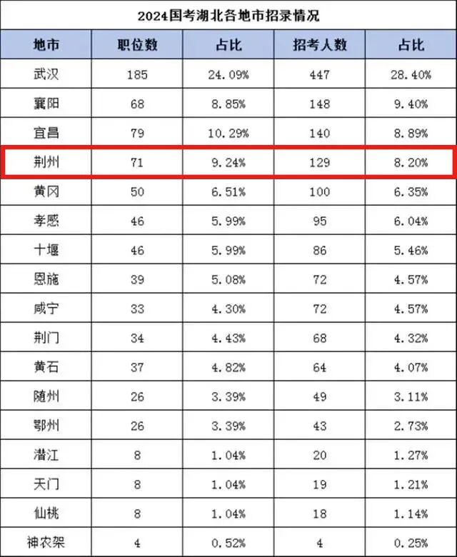 从各地市招录数据统计上可以看出,湖北招录人数较多的前三个地市分别是武汉、襄阳、宜昌。荆州居第四位,共有71个职位,占湖北总职位的9.24%,共招129人,占湖北总招录人数的8.20%。