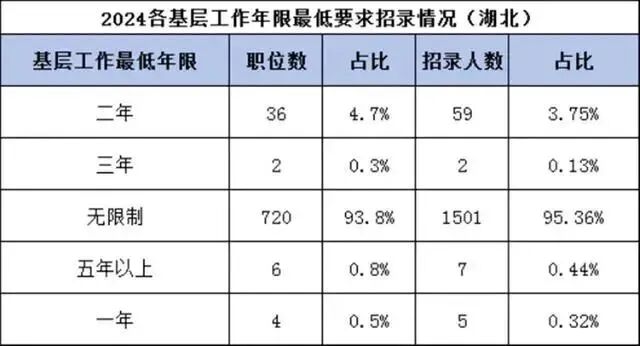 2024国考工作地点在湖北的职位有720个职位,不限制基层工作年限,占总招录职位的93.8%,这些职位共招1501人,占湖北总招录人数的95.36%,这对于大部分考生来说是利好消息。