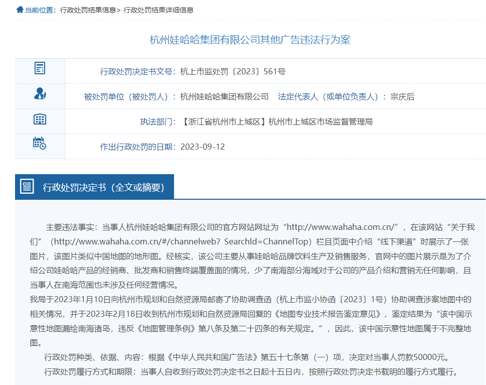 处罚事由显示,当事人在娃哈哈官方网站栏目页面中介绍“线下渠道”时展示了一张图片,该图片类似中国地图的地形图。