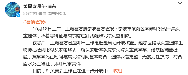 10月18日上午,上海警方接宁波警方通报:宁波市镇海区某滩涂发现一具女童遗体,衣着等特征与浦东南汇新城海滩失踪女童相似。