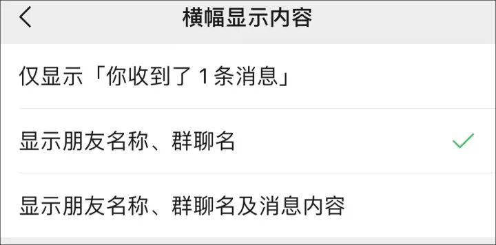 点击可发现,里面有3种内容显示形式,分别为:仅显示你收到1条消息,显示朋友名称、群聊名,显示朋友名称、群聊名及消息内容。