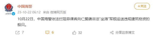 据中国海警,10月22日,中国海警依法拦阻菲律宾向仁爱礁非法“坐滩”军舰运送违规建筑物资的船只。