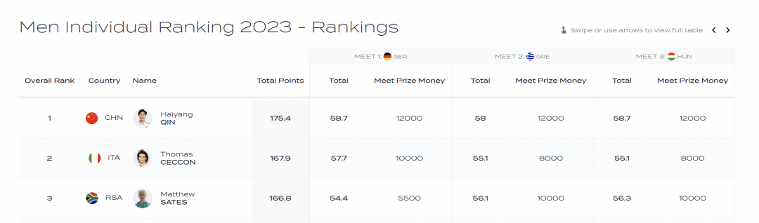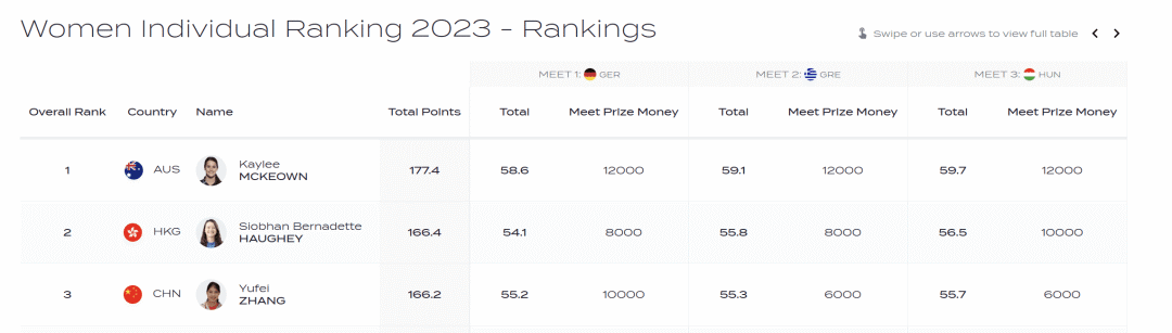 张雨霏则在三站比赛中收获6金3银,以166.2分获得游泳世界杯女子组年度第三名。