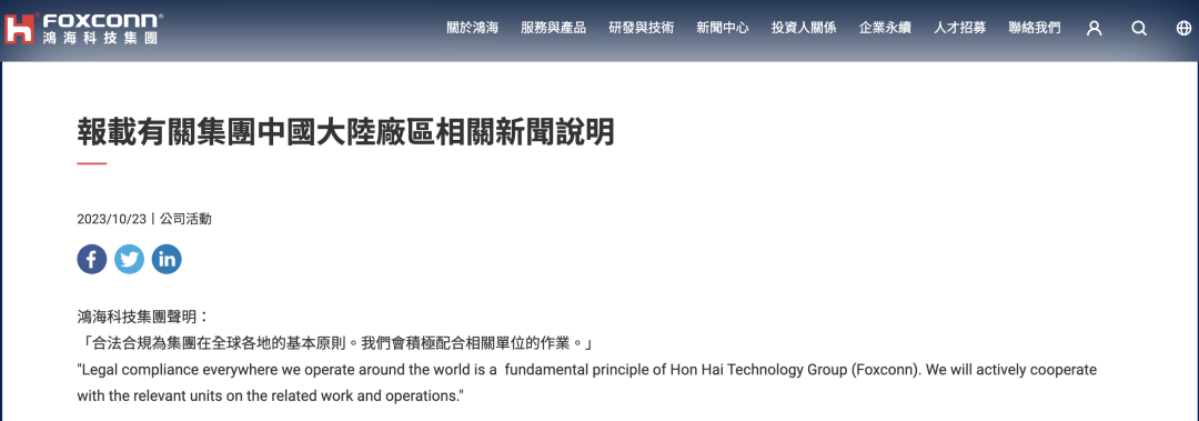 富士康母公司鸿海科技集团官网23日回应:“合法合规为集团在全球各地的基本原则。我们会积极配合相关单位的作业。”