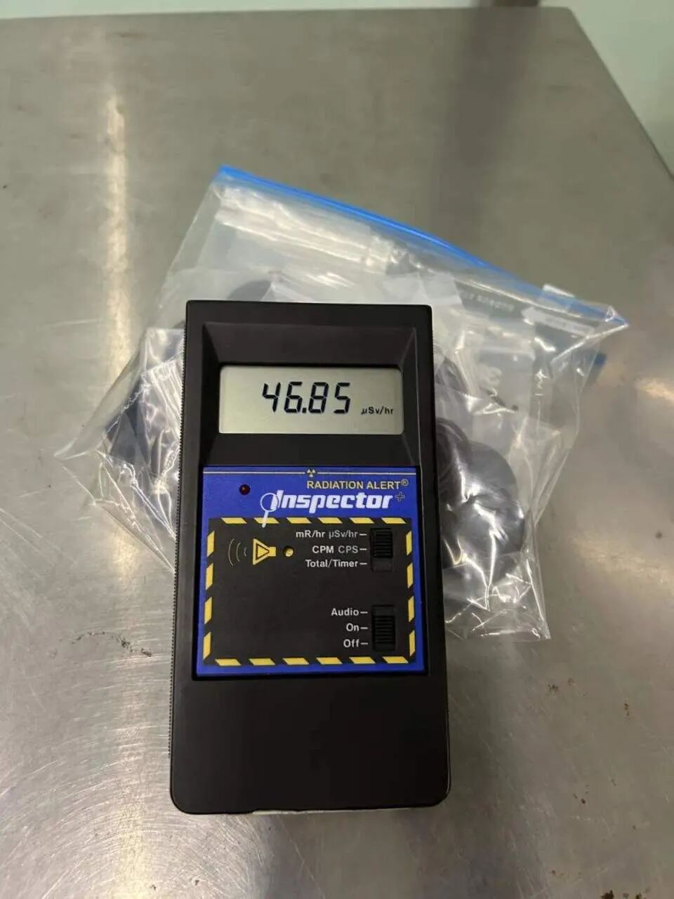 经现场关员复查,该旅客携带的一袋“保健石”核辐射超标,辐射量达105微西弗每小时,超出现场本底值1050倍。