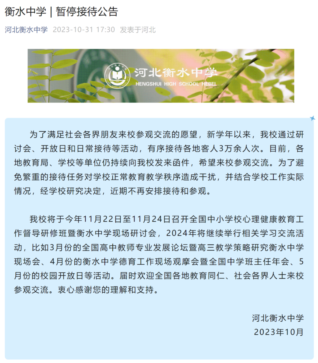 10月31日,衡水中学在其公众号发布“暂停接待公告”,称近期不再安排接待和参观。