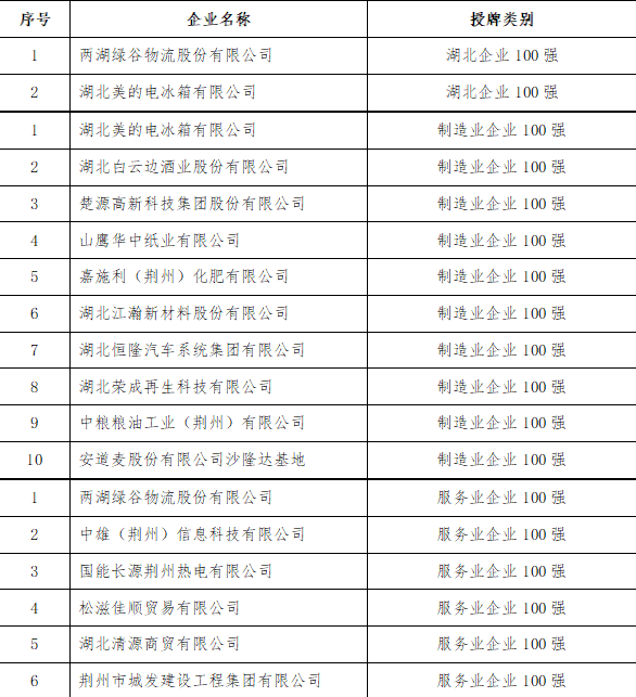 湖北服务业企业100强”名单