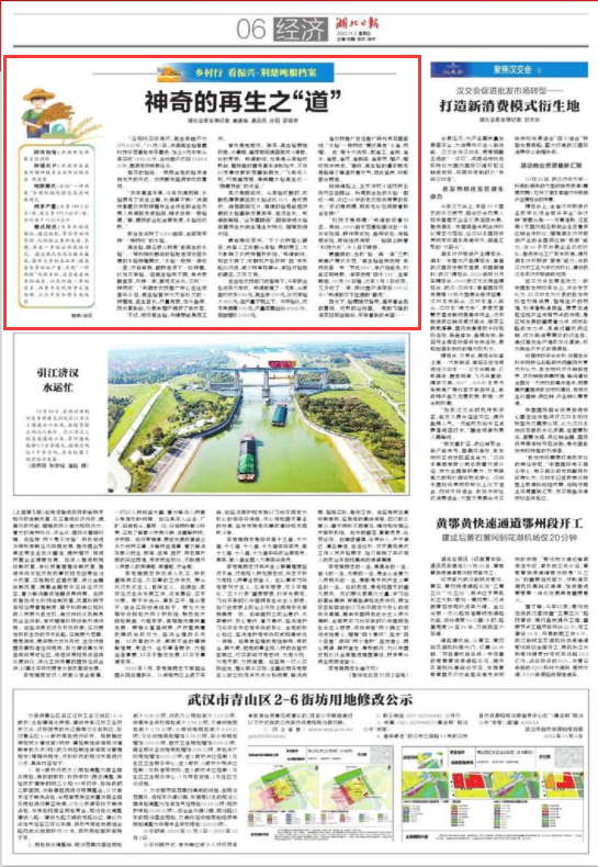 11月3日湖北日报6版刊发《神奇的再生之“道”》一文聚焦洪湖水稻“一种两收”全程机械化模式