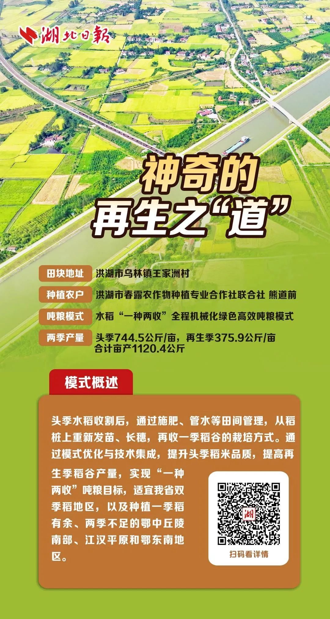 再生稻,顾名思义就是“能再生的水稻”,一种利用收割后的稻桩继续发苗长穗的水稻种植模式。“水稻一般种一季收一茬,然后育秧、翻耕继续下一轮种植,比如双季稻。但再生稻则不同,有点像割韭菜,只种一季,割完还会长,又叫‘一种两收’。”洪湖市农技推广中心主任郑普兵介绍,再生稻曾作为灾后补欠的一种措施,自生自长,产量有限,如今品种、技术革新后,为粮食增产提供了新方案。