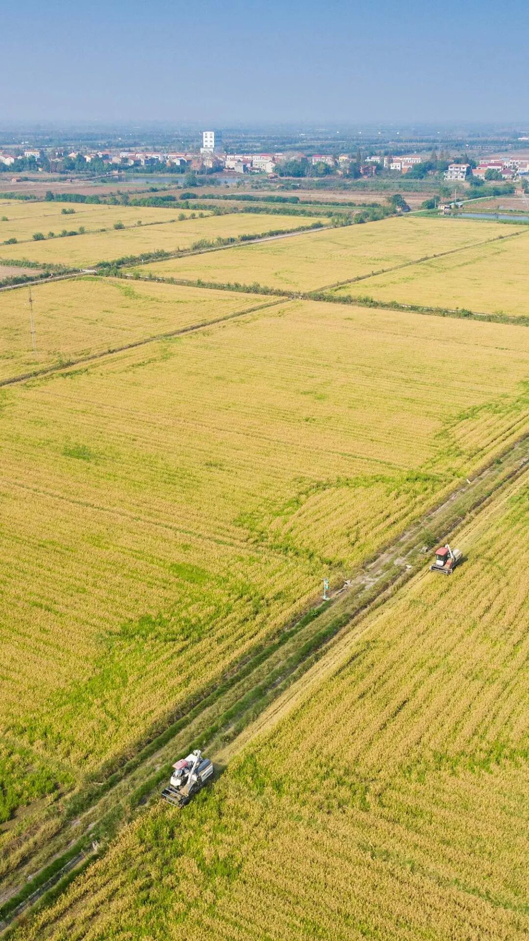 坦荡的稻田,一层层金色的稻浪涌向无尽的天边。农民眼中盛满丰收的喜悦。