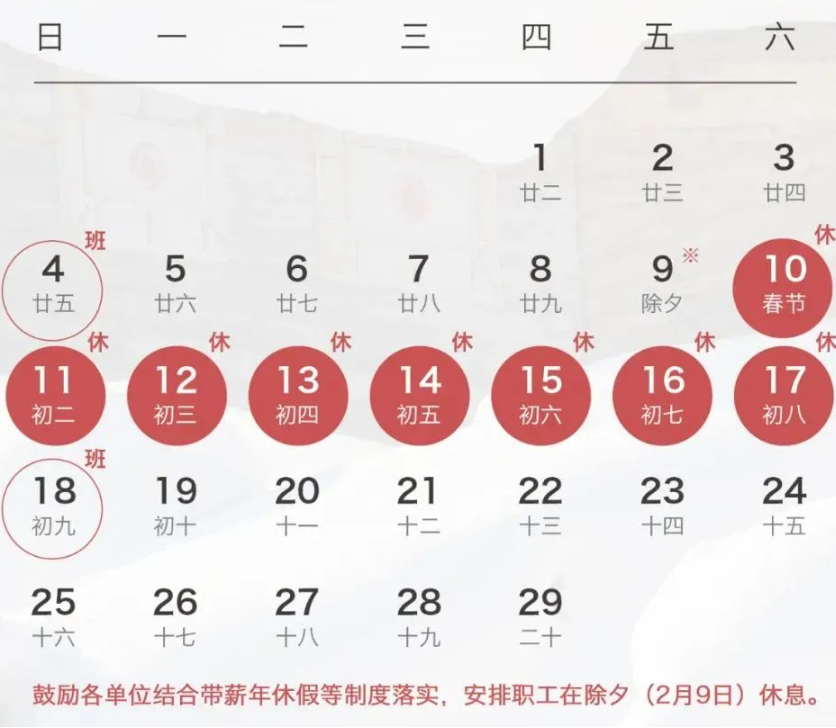 其中,春节假期为2月10日至17日放假调休,共8天,2月4日(星期日)、2月18日(星期日)上班,即除夕不放假。通知中提出,鼓励各单位结合带薪年休假等制度落实,安排职工在除夕(2月9日)休息。