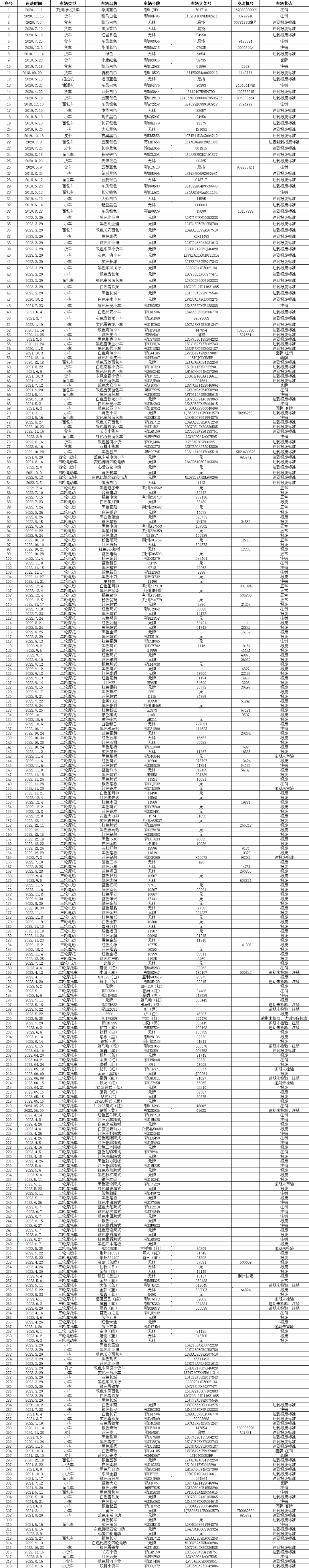 依据《中华人民共和国道路交通安全法》第一百一十二条规定,现对下列逾期未来接受处理的机动车辆进行公告。请相关驾驶人或者所有人、管理人,自本公告发布之日起三个月内,持《公安交通管理行政强制措施凭证》和相关证件,到《公安交通管理行政强制措施凭证》载明的交警大队接受处理。逾期仍不来接受处理的,将依据《中华人民共和国道路交通安全法实施条例》第一百零七条规定依法进行处理。